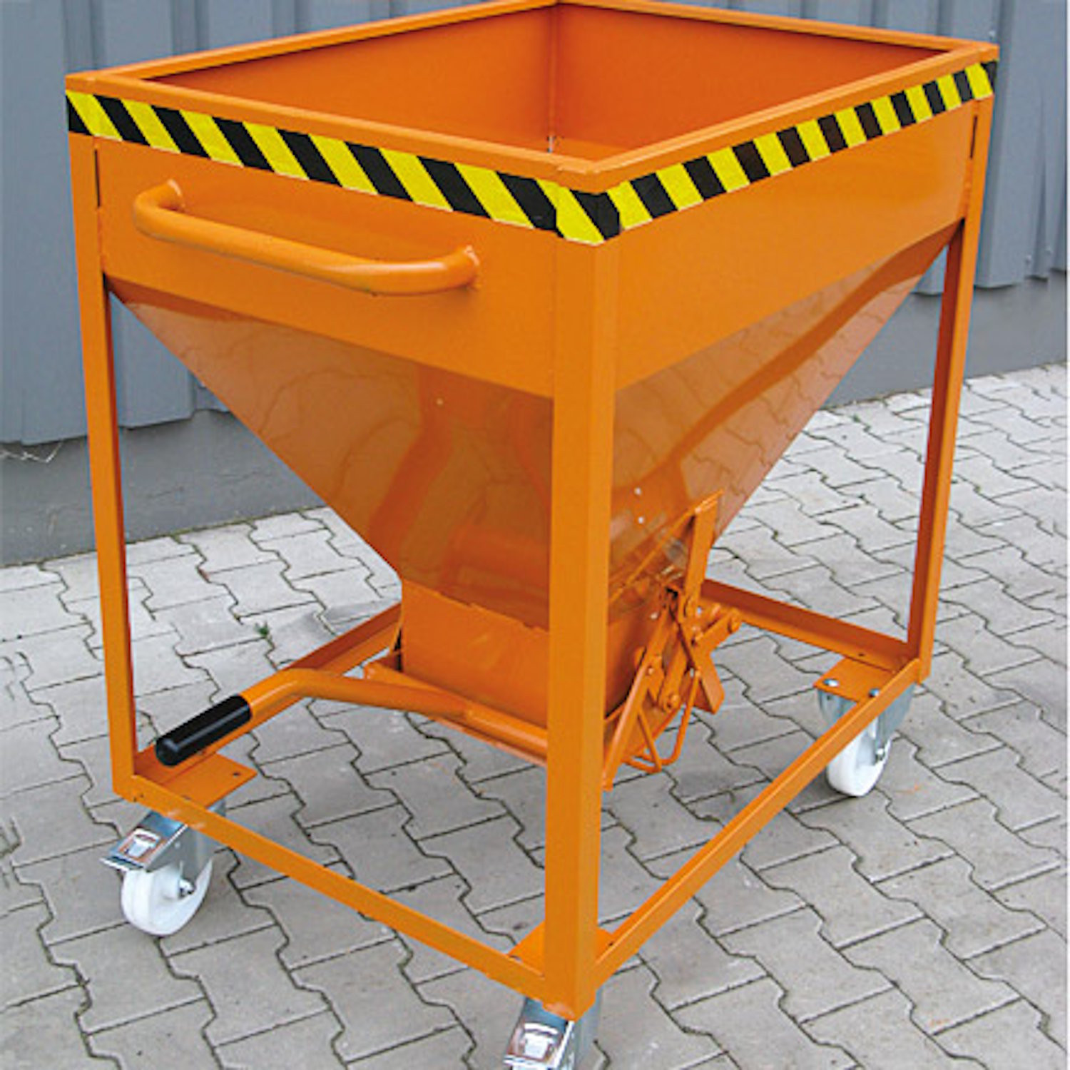 - Bauweise: Trichterförmiger, rechteckiger Behälter aus Stahlblech, umlaufend mit massivem Kantenprofil.