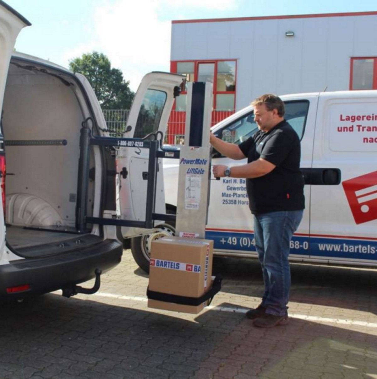 Mit dem PowerMate LiftGate, dem weltweit ersten Hubarm für den Einbau an der Hecktür, lösen sich einige Probleme. Waren mit einem Gewicht von bis zu 227 kg lassen sich damit problemlos verladen. Das Gerät ersetzt damit eine Ladebordwand bzw. einen LKW.