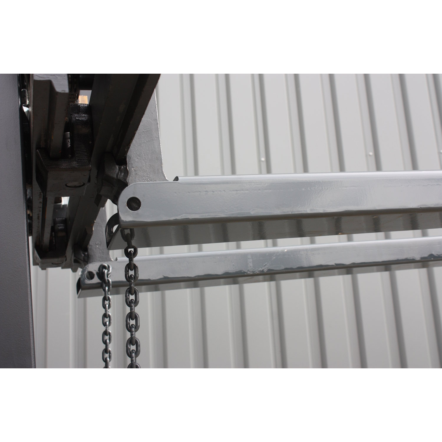 - Stabile Sicherung: Die Arretierung erfolgt über Steckbolzen, die durch eine Kette dauerhaft am Gerät gesichert sind.