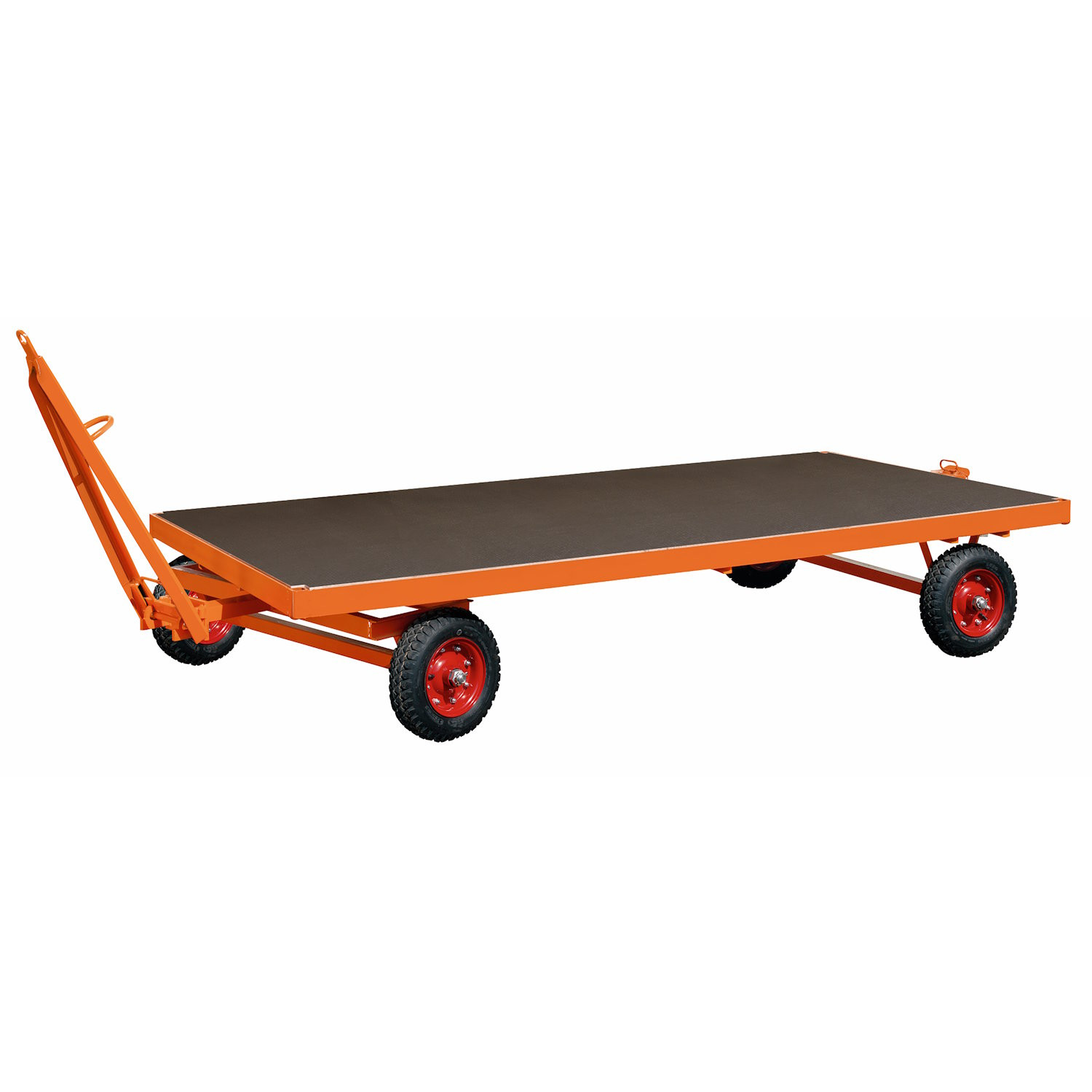 Der Industrieanhänger mit 1-Achs-Drehschemellenkung ist das Rückgrat der modernen Intralogistik für schwere Güter. Dank der extrem robusten, pulsgeschweißten Stahlkonstruktion bewältigt dieser Anhänger mühelos Lasten von bis zu 5 Tonnen. Die Kombination aus einer rutschfesten Siebdruckoberfläche und der stabilen Dreiecksdeichsel inklusive Fallsicherung garantiert ein sicheres Handling beim Materialtransport zwischen Produktionshallen. Ob mit Luftbereifung für empfindliche Güter auf unebenen Wegen oder mit Elastikvollgummi für maximale Tragkraft auf glatten Industrieböden – dieser Anhänger ist für eine Fahrgeschwindigkeit von bis zu 6 km/h optimiert. Mit seiner markanten Lackierung in Reinorange und der Einhaltung höchster Sicherheitsstandards ist er die zuverlässige Wahl für Industrieunternehmen, die Wert auf Langlebigkeit und Effizienz legen.