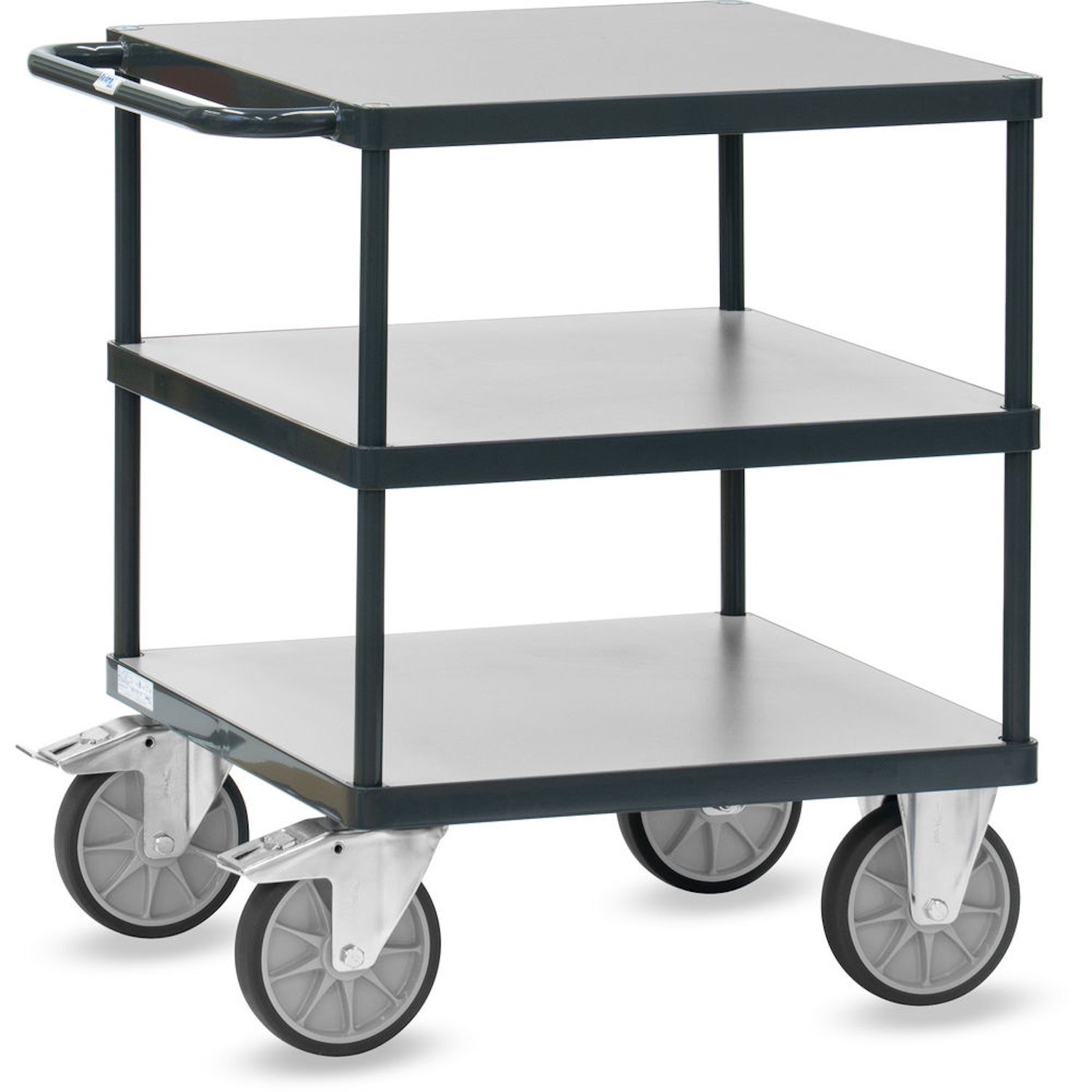 Der Schwere Tischwagen ist eine robuste und flexible Transportlösung für Industrie, Lager und Werkstatt mit einer Gesamttragkraft von 500 kg oder 600 kg. Gefertigt aus dem bewährten MultiVario Baukastensystem (Stahlrohr/Profilstahl geschweißt) und pulverbeschichtet, bietet der Wagen höchste Stoß- und Kratzfestigkeit. Er verfügt über drei quadratische Ladeflächen, wobei die Etagen jeweils 200 kg tragen. Die Systemteile sind einfach zu montieren und bieten Flexibilität. Mit seinen leichtgängigen TPE-Rädern (160 mm oder 200 mm, Rillenkugellager) und den Feststellern an den Lenkrollen eignet sich der Tischwagen ideal für den allgemeinen Warentransport sowie als stabiler Montagetisch auf ergonomischer Arbeitshöhe. Seine Langlebigkeit und hohe Tragkraft machen ihn zum unverzichtbaren Helfer für intensive Transport- und Kommissionieraufgaben.